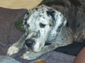Gestern waren wir beim Tierarzt. Tierarzt ist doof. Das gefällt mir da gar nicht. Aber solange Mama oder Papa da sind, bleibe ich halt ruhig und versuche, mir nichts anmerken zu lassen. Trotzdem kann ich's kaum erwarten, bis wir da wieder rausgehen. Der Tierarzt war aber total nett, hat mich komplett durchgecheckt und gesagt, dass ich gar nicht wie eine 6-jährige Dogge aussehe. Sogar meine Zähne sind super in Ordnung, hat er gesagt. Kein Wunder, ich bekomme ja auch immer tolle Kalbsknochen zum Kauen. Das mache ich abends beim Fernsehen am liebsten! Oder halt laut schnarchen. Dann gucken mich die beiden immer an und seufzen "Hach ja, unserer Prinzessin geht's gut." Stimmt!