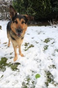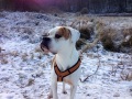 jetzt bin ich schon zwei Jahre bei meiner Familie. Zur Zeit kann ich wieder Frauchen beim Plätzchenbacken zuschauen. Passt wunderbar zu den Winterspaziergängen, wie man sieht. Ansonsten geht es mir bestens, gesundheitlich ist alles prima und die Gemütslage ist auch völlig entspannt. Wir gehen uns auch gerne andere Tiere anschauen, hier im Tierpark oder am Wildgehege, und mit einer Kuh habe ich mich richtig angefreundet, die darf mir sogar das Gesicht ablecken (so ist meine Auffassung von "Bulldog").
