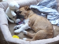 Motte hat die Fahrt ins Münsterland super überstanden. Die beiden Hunde war so ko vom Spielen, dass sie die ganze Fahrt brav zusammen geschlafen haben. Nachdem wir Zuhause angekommen waren, ging es direkt in den Garten und da wurde natürlich auch wieder getobt und alles erschnüffelt. Im Wohnzimmer ging der Spaß dann weiter und anschließend wieder raus in den Garten, wo Motte - jetzt genannt Lotte - auch direkt ihr kleines Geschäft machte. Da die beiden Hunde sich wohl echt gesucht und gefunden haben, haben sie dann auch ihre Mittagsruhe zusammen in einem Körbchen verbracht und das zweite Körbchen blieb leer :-)