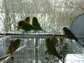 im Anhang sende ich Ihnen ein Bild von acht Ihrer ehemaligen Tierheimschützlinge. Die "4 Tops" haben sich hier unüberhörbar gut eingelebt. Alle acht tschilpen zusammen und lauthals jede noch so kleine Feder an, die vor dem Fenster vorbeifliegt. Und hier gibt es viele Bäume und und daher auch viele Vögel ... Leider kann ich Ihnen die Geräuschkulisse nicht mitsenden. Drei von den "4 Tops" fliegen schon zusammen mit den anderen vier Wellies munter im Zimmer herum. Die grau-blaue oben rechts auf dem Käfig ist ein als Wellensittich getarntes Nagetier und hat sich hier mit dem türkisfarbenen Männchen, das separat gekommen war und auf dem Bild unter ihr sitzt, zu einem glücklichen Paar zusammengefunden. Oben links auf dem Käfig sitzt eines meiner beiden Weibchen, das sich für einen der "4 Tops" interessiert, was diesem aber noch nicht ganz geheuer zu sein scheint. Sie läßt sich davon aber nicht entmutigen. Mal abwarten, was draus wird.